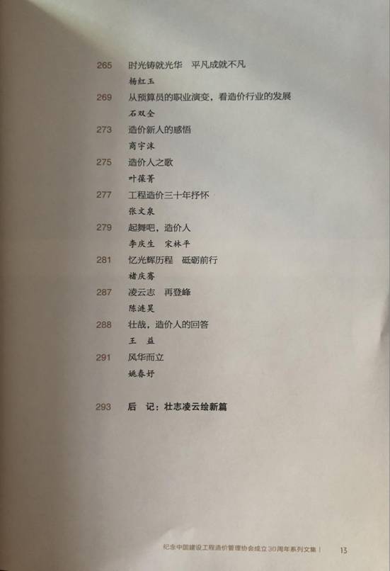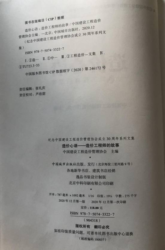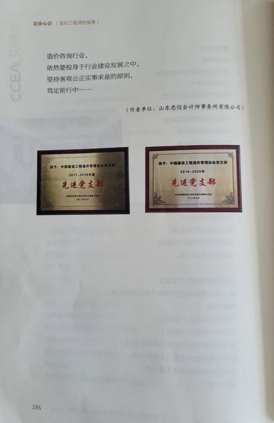 由中國(guó)建設(shè)工程造價(jià)管理協(xié)會(huì)主編,中國(guó)城市出版社出版的紀(jì)念中國(guó)建設(shè)工程造價(jià)管理協(xié)會(huì)成立30周年文集《造價(jià)心語(yǔ)——造價(jià)工程師的故事》已于2020年12月出版發(fā)行,在全國(guó)各地新華書(shū)店、建筑書(shū)店經(jīng)銷(xiāo)發(fā)售,由山東忠信會(huì)計(jì)師事務(wù)所有限公司董事長(zhǎng)褚慶騫親筆撰寫(xiě)的文章《憶光輝歷程 砥礪前行》收錄刊登于本書(shū)281-286頁(yè)。 注: 在中國(guó)建設(shè)工程造價(jià)管理協(xié)會(huì)(以下簡(jiǎn)稱(chēng)中價(jià)協(xié))成立30周年之際,為展現(xiàn)中國(guó)工程造價(jià)行業(yè)的發(fā)展歷程、取得的重要成就,展現(xiàn)工程造價(jià)行業(yè)工作者們不斷求知、探索、創(chuàng)新的精神,中價(jià)協(xié)組織編寫(xiě)了紀(jì)念中價(jià)協(xié)成立30周年系列文集,其中《造價(jià)心語(yǔ)——造價(jià)工程師的故事》正式出版。 《造價(jià)心語(yǔ)——造價(jià)工程師的故事》由中價(jià)協(xié)主編,中國(guó)城市出版社出版、發(fā)行(北京海淀三里河路9號(hào))各地新華書(shū)店、建筑書(shū)店經(jīng)銷(xiāo),逸品書(shū)裝設(shè)計(jì)制版,北京中科印刷有限公司印刷。16開(kāi)本,2020年12月第一版,2020年12月第一次印刷,定價(jià)118元。 在第281頁(yè)刊登了所長(zhǎng)褚慶騫同志投稿的《憶光輝歷程 砥礪前行》。 精彩搶先看